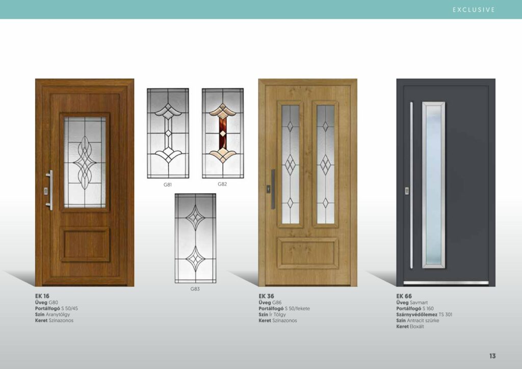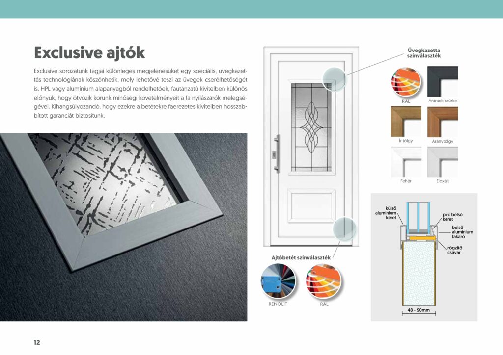 Az Exclusive sorozat különleges megjelenését a speciális üvegkazettás technológiának köszönheti, amely az üveg cserélhetőségét is lehetővé teszi. HPL vagy alumínium alapanyaggal rendelhető, és fautánzatú kivitelben is elérhető, így a modern műszaki szintet a fa nyílászárók melegebb karakterével ötvözi.