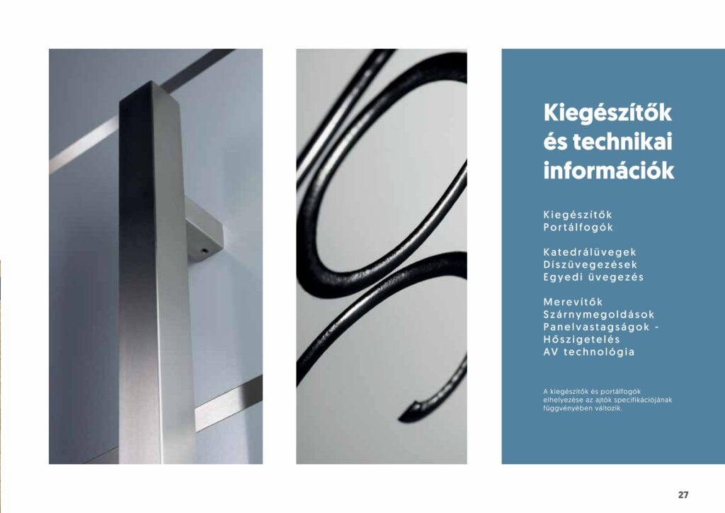 A részletes modellspecifikációk, portálfogó méretek, üvegtípusok és panelvastagságok külön alszekciókban is feldolgozhatók, ha a teljes katalógust több egymásra épülő Elementor blokkra szeretnéd bontani.