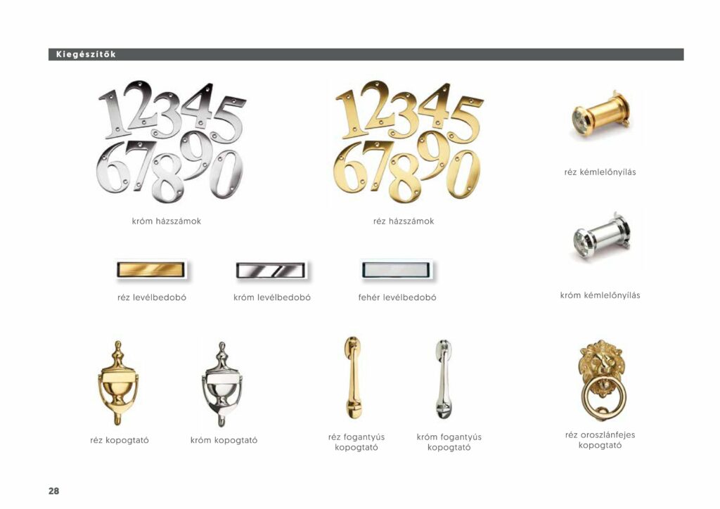 Kémlelőnyílások, házszámok, kopogtatók, levélbedobók és további szerelvények többféle kivitelben.