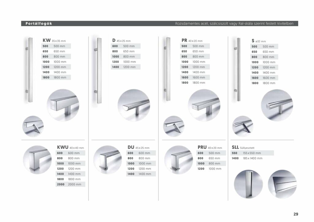 Többféle profil- és méretválaszték, rozsdamentes acél, szálcsiszolt vagy RAL szerint festett kivitelben.