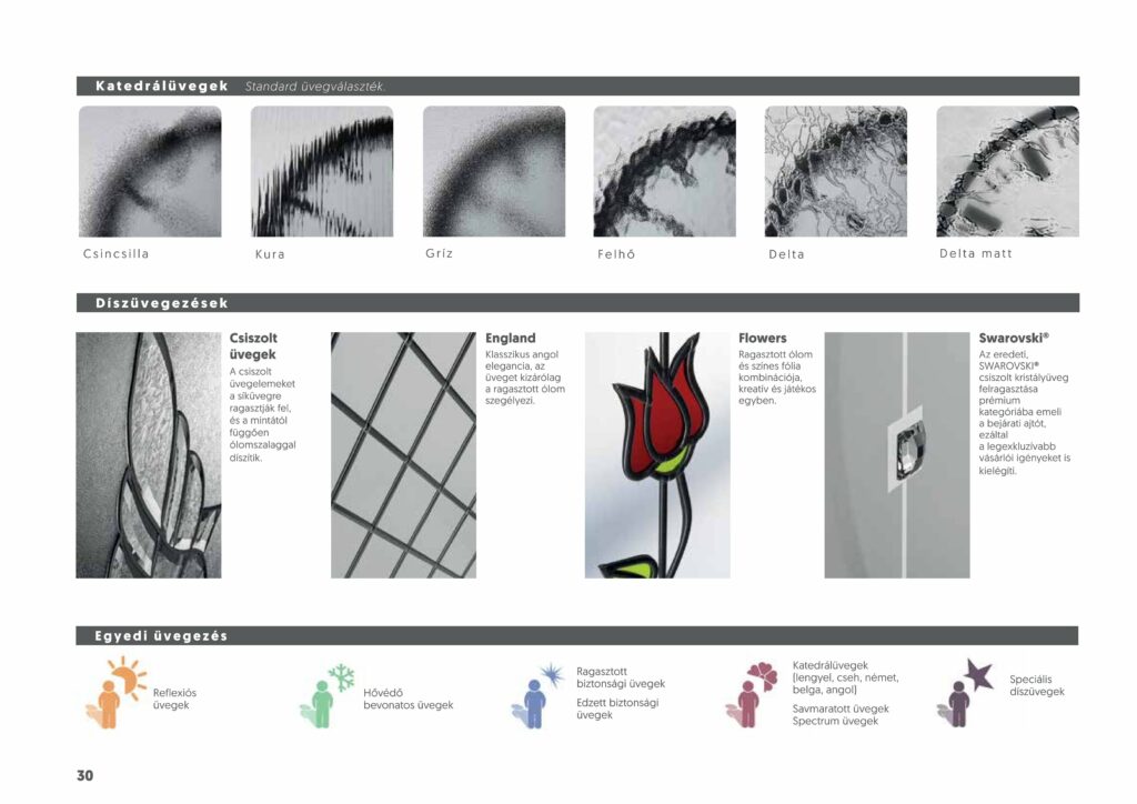 Csiszolt, katedrál-, savmaratott, spectrum, ragasztott és edzett biztonsági üvegek, illetve egyedi megoldások.