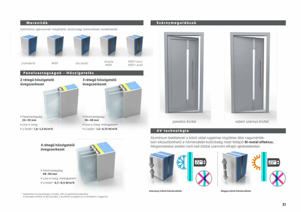 24–90 mm panelvastagság, 2-, 3- vagy 4-rétegű hőszigetelő üvegszerkezetekkel, eltérő U-érték tartományokkal.